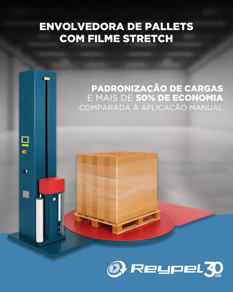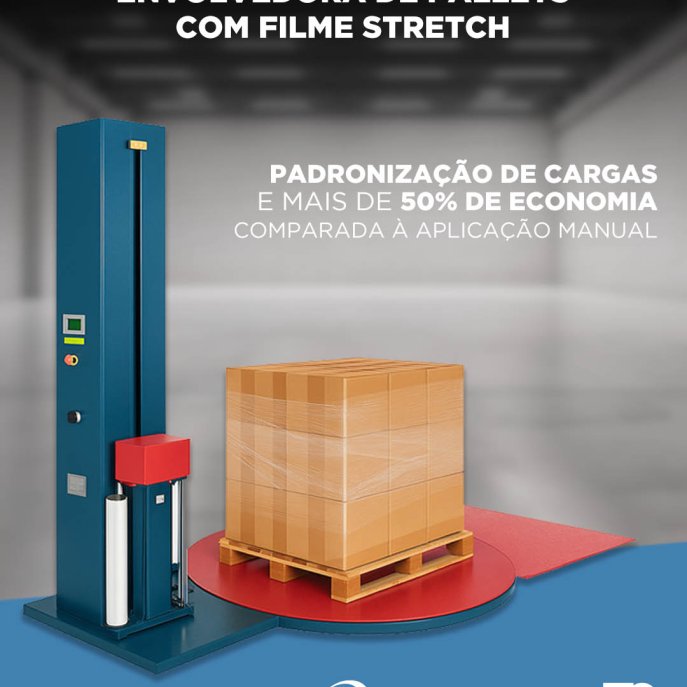 - Aumento da produtividade: envolve pallets de forma rápida e consistente, agilizando a expedição.